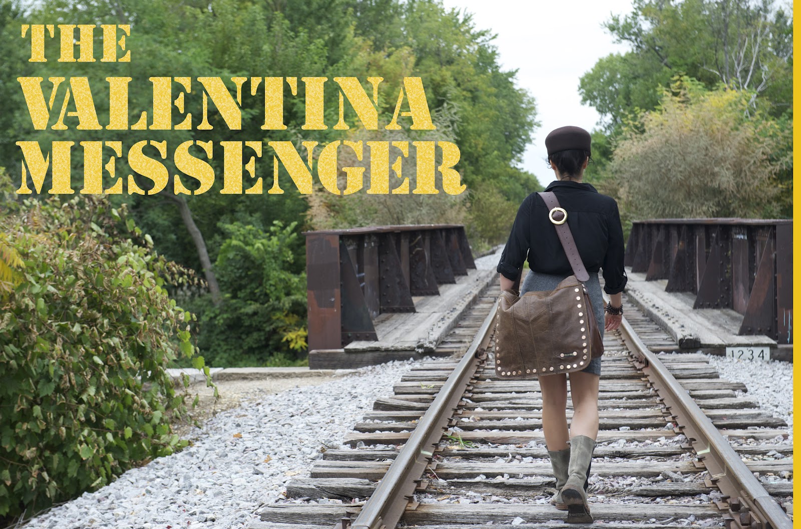 up top you see THE VALENTINA crafted of a full grain, re-purposed deep umber leather. flaunting a fully riveted front flap with chevron detailing, interior lap top compartment, adjustable shoulder/cross-body strap with brass bull ring buckle, and a separate zipper pocket for gadgets on the go.